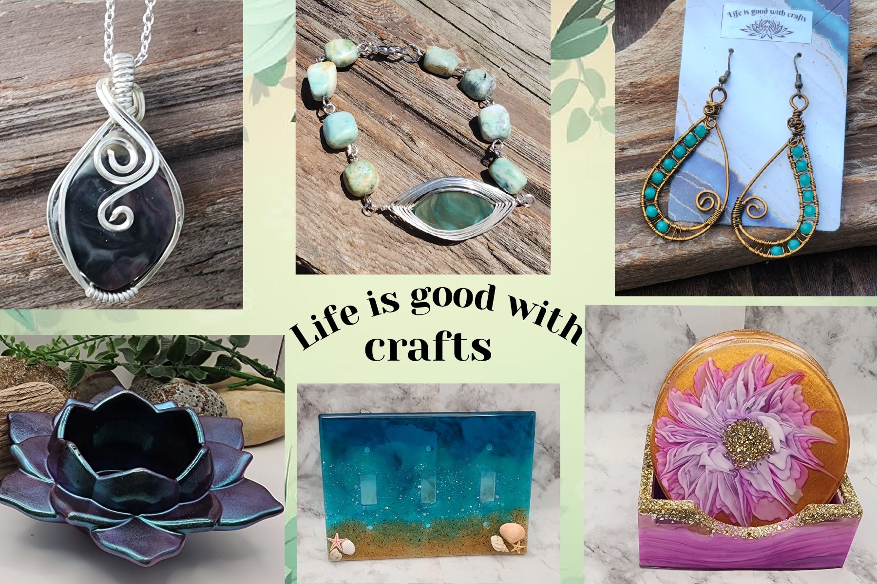 I specialize in handcrafted jewelry—featuring wire-wrapped earrings, bracelets, necklaces and rings with intricate designs incorporating resin cabochons and stones. In addition, my resin art collections include vibrant coasters, stunning cutting boards, and elegant vanity trays—each made with meticulous attention to detail and a personal touch.